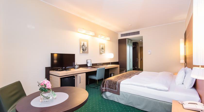 Просторный номер с кондиционером и ванной комнатой. В числе прочих удобств — большая двуспальная кровать, мини-бар и телевизор. Из окон открывается вид на город.